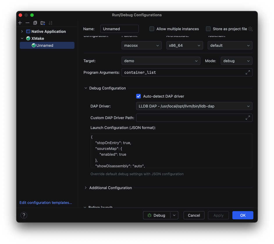 尤其是增加了对 lldb/gdb-dap 的调试支持,现在我们不再需要通过生成 CMakeLists.txt 去变相支持调试了,而是直接支持调试 xmake 项目。